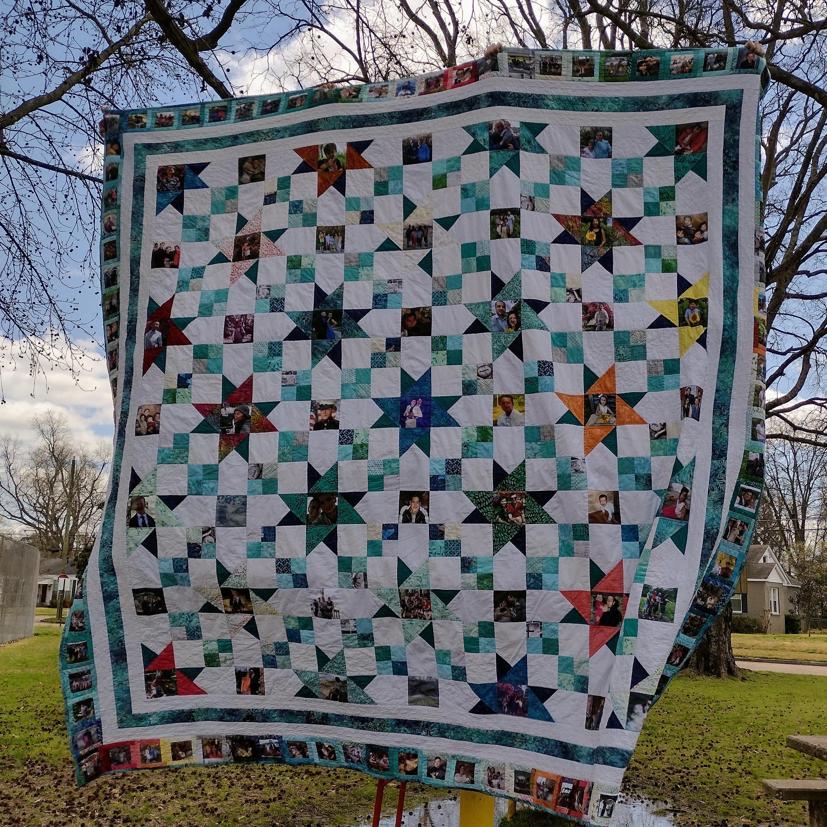 Well, Joy Y did just that and created this beautiful modified Friendship Star memory quilt. Joy said she added all her fabrics and pictures ahead of time to plan her quilt layout. What a wonderful memory quilt!